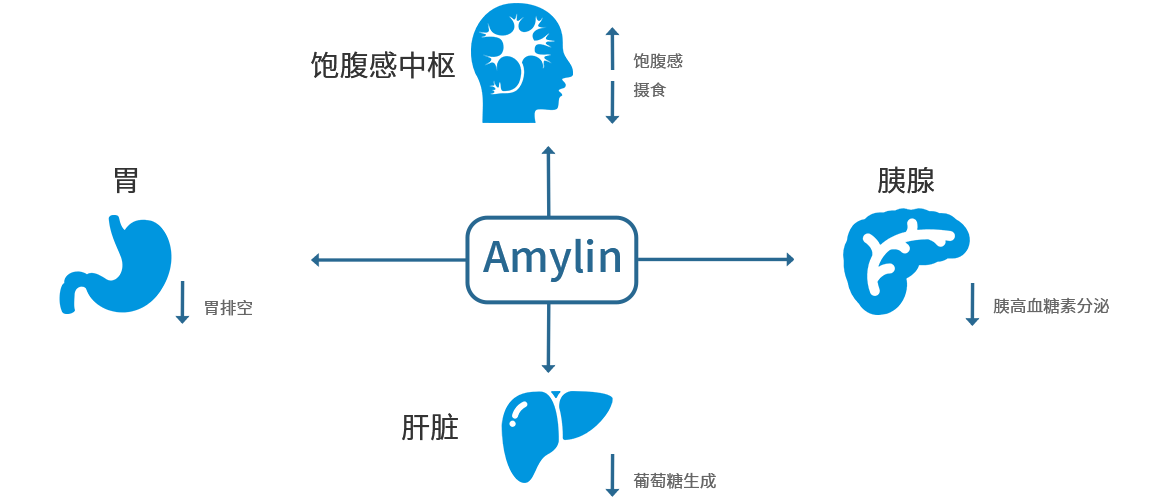 Amylin(胰淀素)是一種由胰腺β細胞產生并與胰島素共同分泌的37個氨基酸的肽類激素。Amylin可降低食欲和減緩胃排空,Amylin類似物通過不同的Amylin受體增加飽腹感,并增強瘦素敏感性。由于內源性Amylin作用時間短,藥物研發人員已研發出用于治療的長效型Amylin類似物。